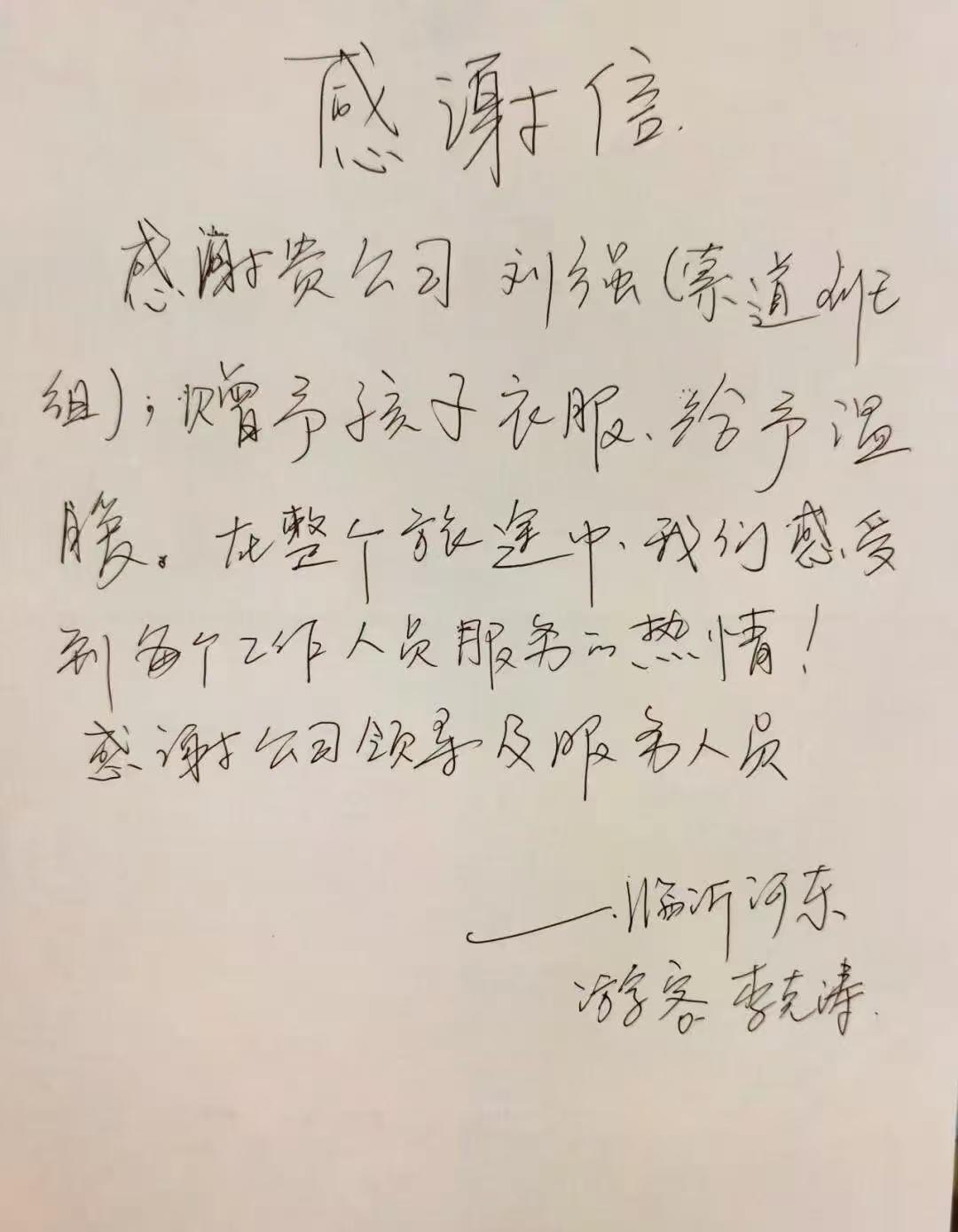 也是上周末,沂蒙山龟蒙景区工作人员收到了一封特别的感谢信,更准确地说是一纸短笺,临沂河东游客李克涛感谢索道值班人员刘强赠予孩子衣服,给予温暖。“在整个旅途中,我们感受到每个工作人员服务的热情!”短短数语,让收到信笺的景区工作人员立刻感到温暖,这个冬季都特别温暖,更增加了服务的劲头。原来,景区索道员工刘强在接待游客时,发现其中一个年幼游客衣着单薄,当即将自己的备用衣物赠予其御寒,这个正常的举动竟让游客一家人深深感动。